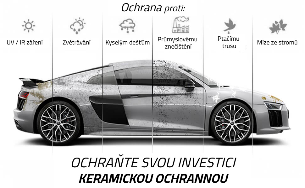 Nejmodernější způsob ochrany: laku, kol, plastů i skel, nano keramickým povlakem (SiO2), který zajistí velice vysokou míru ochrany, proti negativním vlivům, kterým bude auto na cestách čelit.